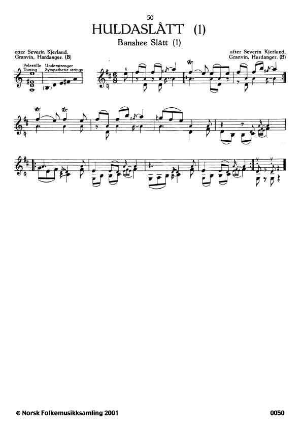 (Huldaslått (1)) B. 915. Oppskr. 1918. Kjerland hadde lært slåtten av Lars Røynstrond, (Halte-Lars), Granvin, Hardanger i 1890-åra. Det er ein variant av Iydarslåtten St. Tomasklokke-slåtten.