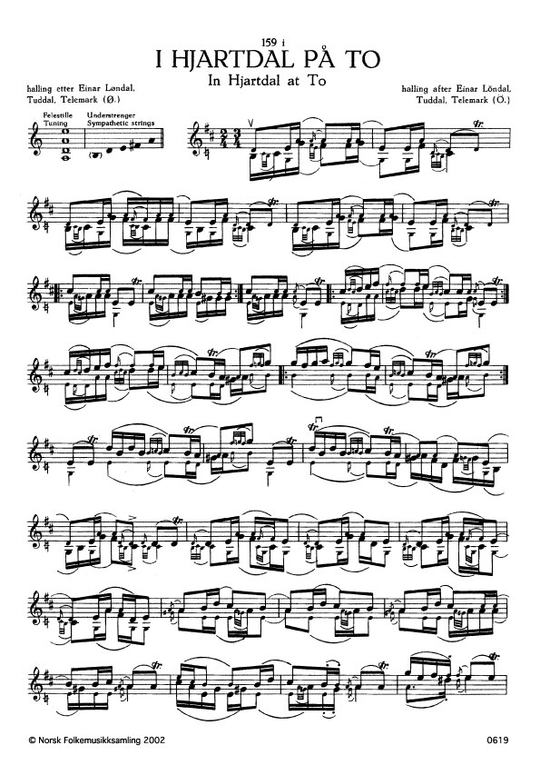 (I Hjartdal på To) Ø. 399. Oppskr. 1950. Løndal hadde slåtten etter Kjetil Finseker, Tuddal, Telemark. Slåttenamnet kjem av stevet: "Har du 'kje vore i Hjartdal på To, har du 'kje hoppa so hoppa du no".
