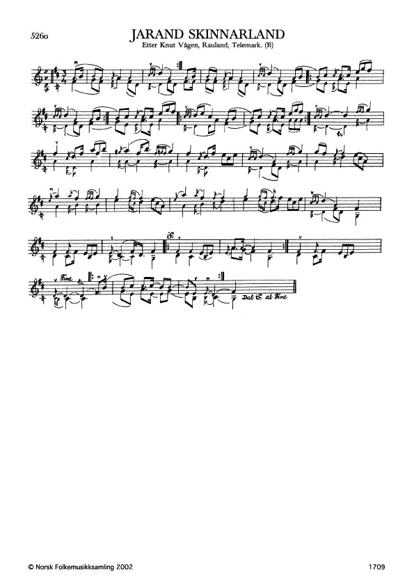 Jarand Skinnarland. Etter Knut Vågen, Rauland, Telemark. B. 796a, 1937. Vågen hadde lært slåtten av far sin, Ketil Håvardson, som igjen hadde han frå sin far, Håvard Gibøen.