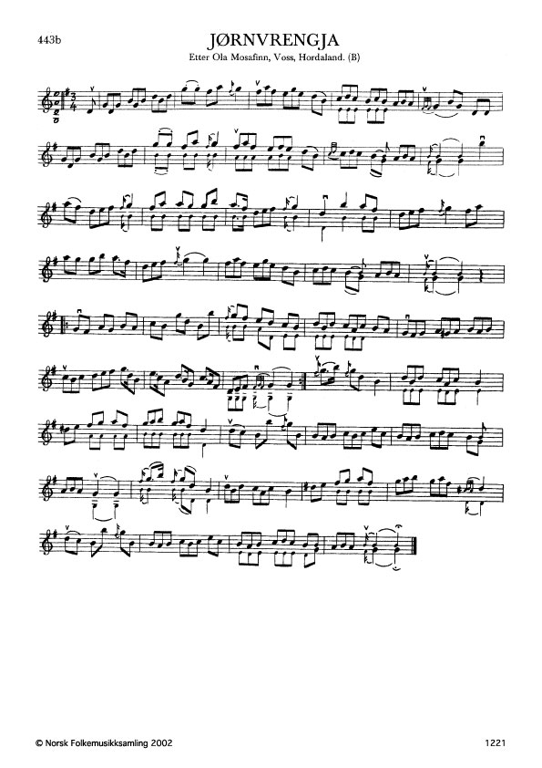 Jørnvrengja. Etter Ola Mosafinn, Voss, Hordaland. B.N.SI. 35, 1908. Mosafinn lærde slåtten av Nils Hilme, son til Jørn Hilme, på Lærdalsmarknaden i 1850. Mosafinn laga si eiga form, og omlag slik blir slåtten framleis spela på Vestlandet. Fyrste veket til Mosafinn svarar nokolunde til siste veket i Olav Moes form (443a) medan dei siste to veka er identiske med ein rørospols. Jfr. Haugen og Reitans 100 Norske Slaatter nr. 25 og Sven Nyhus' Pols i Rørostraktom nr. 31.