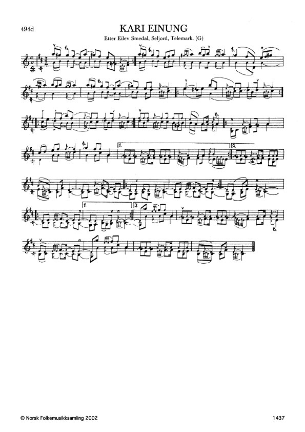 Kari Einung. Etter Eilev Smedal, Seljord, Telemark. G. 370, 1936. Slåtten er litt i slekt med springaren Saltevju, band 5, nr. 374a.