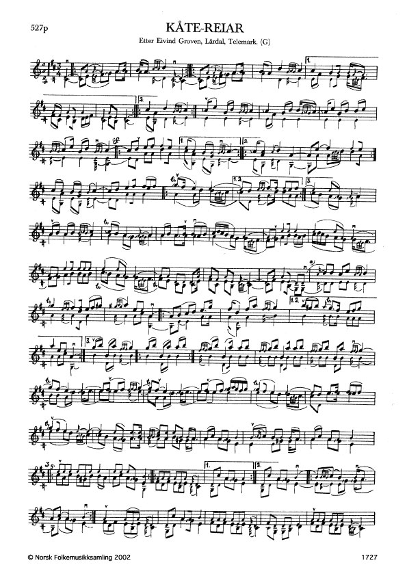 Kåte-Reiar. Etter Eivind Groven, Lårdal, Telemark. G. 1158, 1959. Groven forma ut slåtten på grunnlag av fleire variantar. Andre variantar: G. 595, etter Olav R. Berge.