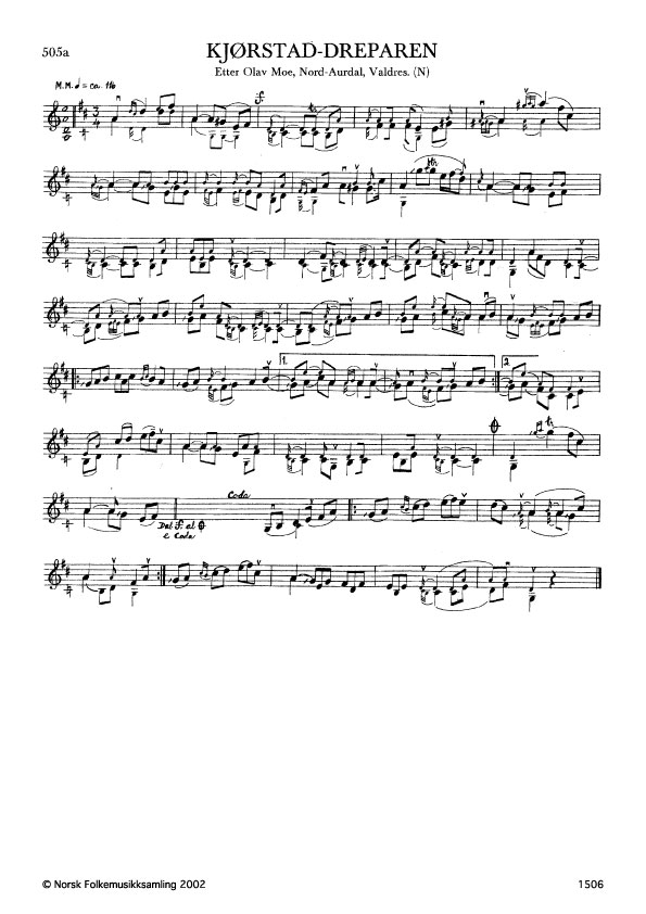 Kjørstad-dreparen. Etter Olav Moe, Nord-Aurdal, Valdres. N. 1976. Td. 291. Jfr. G. 1389 etter Olav Moe, G. 1130 etter Torleiv Bolstad, og G. 648 etter Herbrand Hagen. Slåtten fekk namnet fordi han blei spela då eit alvorleg slagsmål braka laust under brudlaup på Øvre Dale i 1823, der brørne Tølleiv og Haldor Revling vart drepne. O. K. Ødegaard: Gamalt fraa Valdres. Kristiania 1911, s. 159-165, Tidsskrift for Valdres historielag, 40. årgang. 1963, s. 64-73. Slåtten minner noko om Sortebergen, band 4 nr. 248.