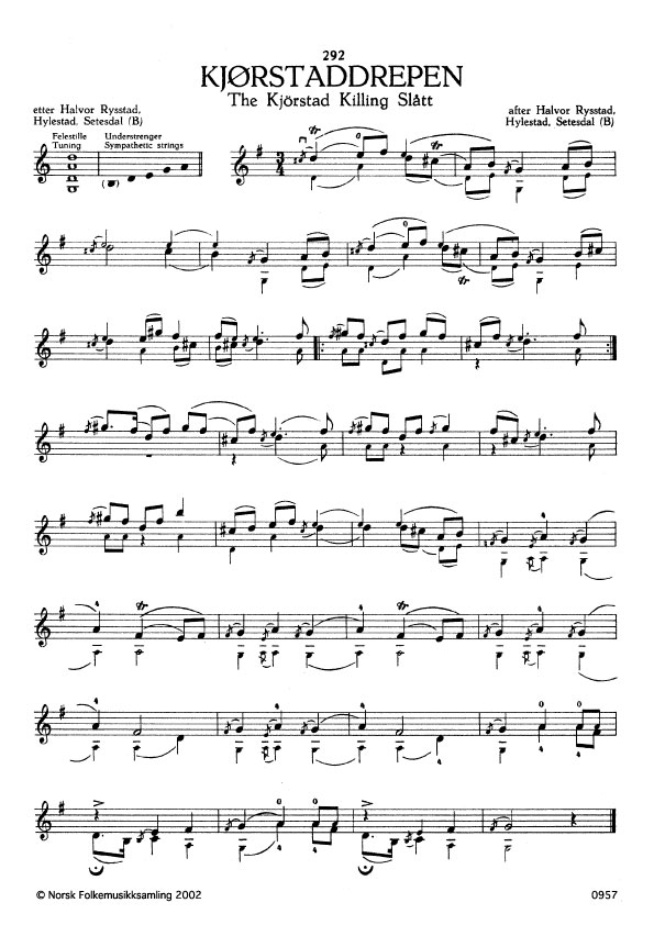 (Kjørstaddrepen) B. 585. Oppskr.1917. Rysstad hadde lært slåtten på ei amerikaferd av Saem (Sem) Sørensen, som var fødd i Bygland, Setesdal. Far hans var spelemann og i ætt med Neri Nese. Sørensen hadde fått slåtten av Knut Sjåheim (Sjåheimsguten), Vestre Slidre, Valdres, som budde i Bryant, Washington, USA. Sjåheim døydde 1910 om lag 70 år gamal. Kjørstad, gard i Valdres. Der var det eit bryllaup, og medan dei dansa, kom ein forsmådd friar med ein fylgjesvein, og under ein dans freista friaren å drepa brudgomen. Men det enda med at dei to som freista ta livet av brudgomen, sjølv vart drepne. Brudgomen vart og stakken, men kom seg att. Den slåtten som vart spela medan slagsmålet sto på, kalla dei etterpå "Kjørstaddrepen". Sjå Halvard Bergh, Folkeminne frå Valdres og Hallingdal i Norsk Folkekultur, Risør 1922. O. K. Ødegaard, Gamalt frå Valdres (Kra. 1911), s. 159. Det skal vera denne segna som Welhaven skreiv diktet Aasgaardsreien over. Spelmannsbladet, 1959, nr. 3 - 4, s. 20.