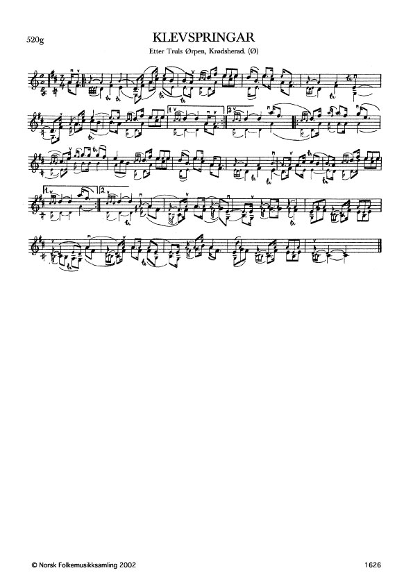 Klevspringar. Etter Truls Ørpen, Krødsherad. Ø. 584. Ørpen hadde slåtten etter Johan Kleven, og skreiv han opp etter minnet i 1956. Kleven hadde slåtten frå far sin, Ola Helgesen Kleiva (Gammel-Kleven).