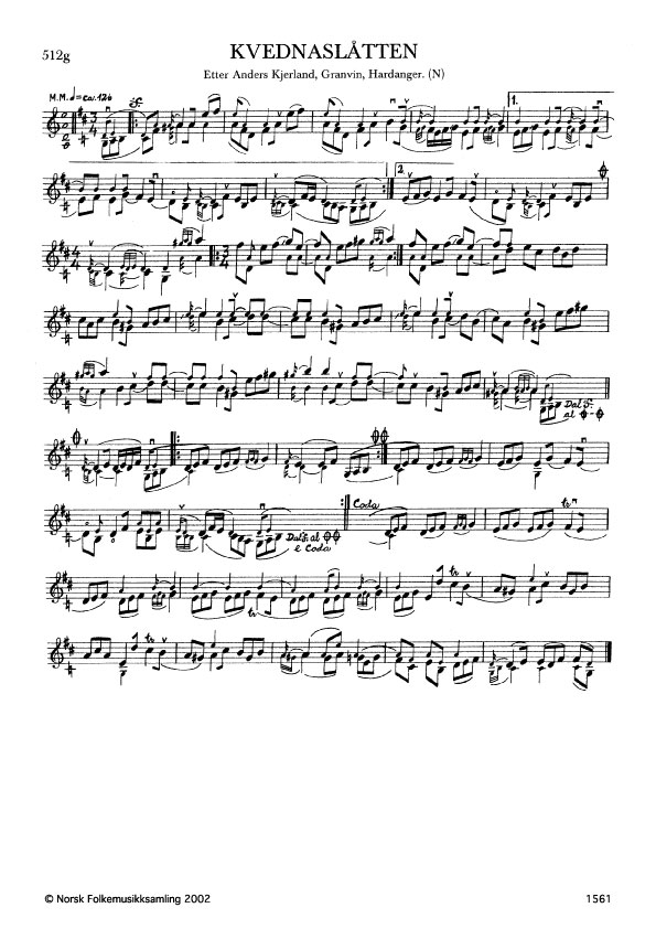 Kvednaslåtten. Etter Anders Kjerland, Granvin, Hardanger. N. 1977. Td. 1377. Kjerlånd lærde slåtten av Nils Eide (Tråen), Hardanger. Andre variantar: B. 2228 etter Andr. Hauge; G. 387 og 722 etter Ø. Hovdestad; G. 583 etter B. Høgetveit.
