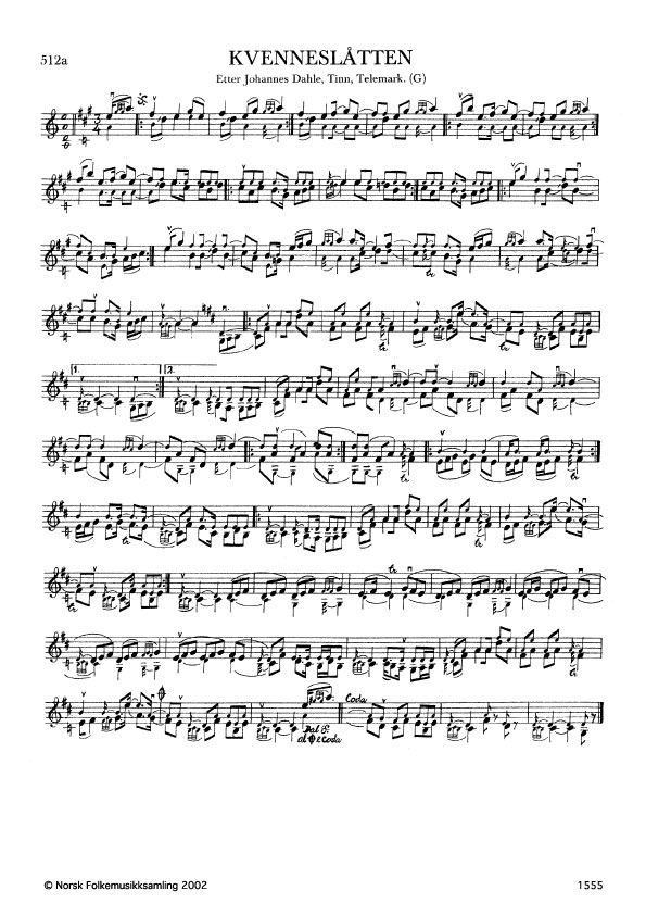 Kvenneslåtten. (Dahle'n nr. 1). Etter Johannes Dahle, Tinn, Telemark. G. 1285, 1961 etter uidentifisert NRK magn. Jfr. G. 1147, 1118 og Ø. 483. Slåtten er namngjeven av Sjur Helgeland, Vossestrand.