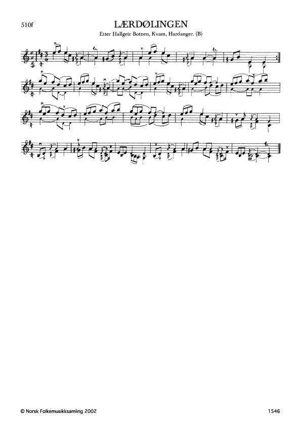 Lærdølingen. Etter Hallgeir Botnen, Kvam, Hardanger. B. 804, 1930. Botnen hadde lært slåtten ikring l900 av Nils Flatabø, Kvam. Han kalla dei "Vinstrehandsplogen" fordi han spela med keiva. Flatabø hadde slåtten etter ein spelemann som var på Lærdalsmarknaden om lag 1840.