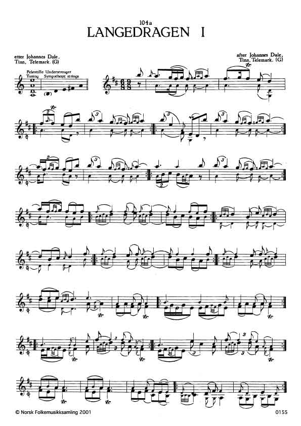 (Langedragen I) G. 1003. Oppskr. 1955 etter opptak i NRK. Dale hadde slåtten etter farfar sin, Knut Dale, Tinn, Telemark. 104a-d er variantar. Jfr. St. Tomasklokkeslåtten B.N.SI. 26.