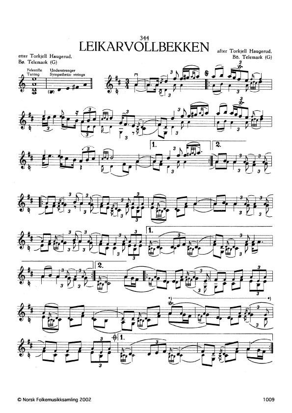 (Leikarvollbekken) G. 1377. Oppskr. 1961 etter opptak i NRK. Haugerud har laga slåtten. Fyrste taket noko likt "Saltevju". Slåttenamnet etter ein bekk som rann framom der Haugerud budde. Jfr. Ø. 322.