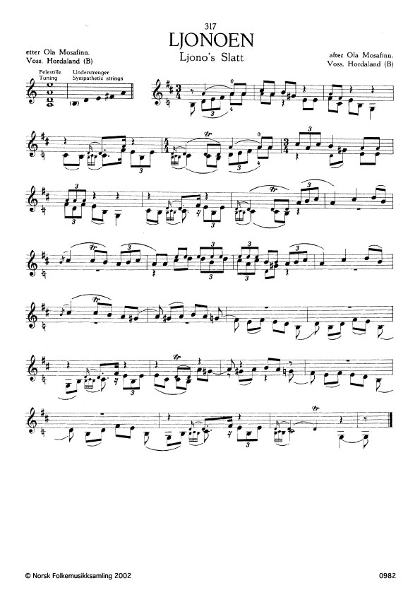 (Ljonoen) B. 429. Oppskr. 1908. Mosafinn hadde lært slåtten i 1850 av Torbjørn Kvalvik, Ulvik, Hardanger, som budde på garden Ljono i Ulvik og vart kalla Ljonoen. Jfr. B. 337.
