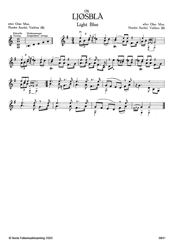 (Ljøsblå) B. 2193. Oppskr. 1947. Johan Svendsen har nytta denne springaren i Rapsodi nr.3. Slåttenamnet etter felestillet to kvintar + kvart, som dei kallar Ijosblå eller Ijosblått.