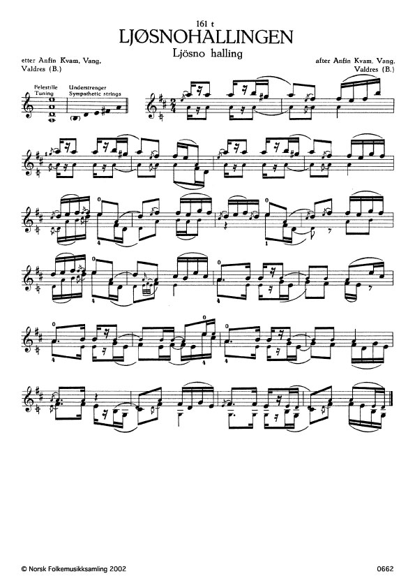 (Ljøsnohallingen) B. 1028. Oppskr. 1946. Kvam hadde lært slåtten av far sin Trond Eldtun, Vang, Valdres. Slåttenamnet etter dansaren Anders Ljøsno (Lysne), Lærdal, Sogn, som nekta militærteneste og vart avretta 1803. Sjå Norsk Folkekultur, 1922, s. 147, og Johan Lindstrøm, Lærdal, Oslo 1946, s. 62 ff. Spelmannsbladet 1950, nr. 2, s. 11, G. Kirkevoll. Ljøsnehallingen.