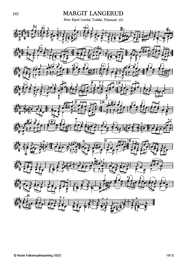 Margit Langerud. Etter Kjetil Løndal, Tuddal, Telemark. G. 1897, 1972. NRK magn. 54290. Jfr. Td. 1667. Slåtten er etter Ole Olsen Kolsrud, Heddal (1827-1902). Løndal lærte han av Anund Haugan, Heddal. Jfr. band 1 nr. 101, og dette bandet nr. 152.