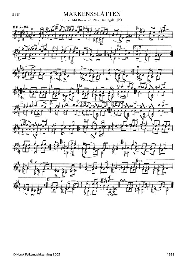 Markensslåtten. Etter Odd Bakkerud, Nes, Hallingdal. N. 1977. Td. 1716. Bakkerud lærde slåtten av Jørgen Husemoen, Nes, som atter hadde han frå Tor Grimsgard, også frå Nes. Grimsgard hadde lært slåtten av Lars Fykerud, Telemark, då dei var saman på Kongsbergmarken ein gong. Derfor dette slåttenamnet.