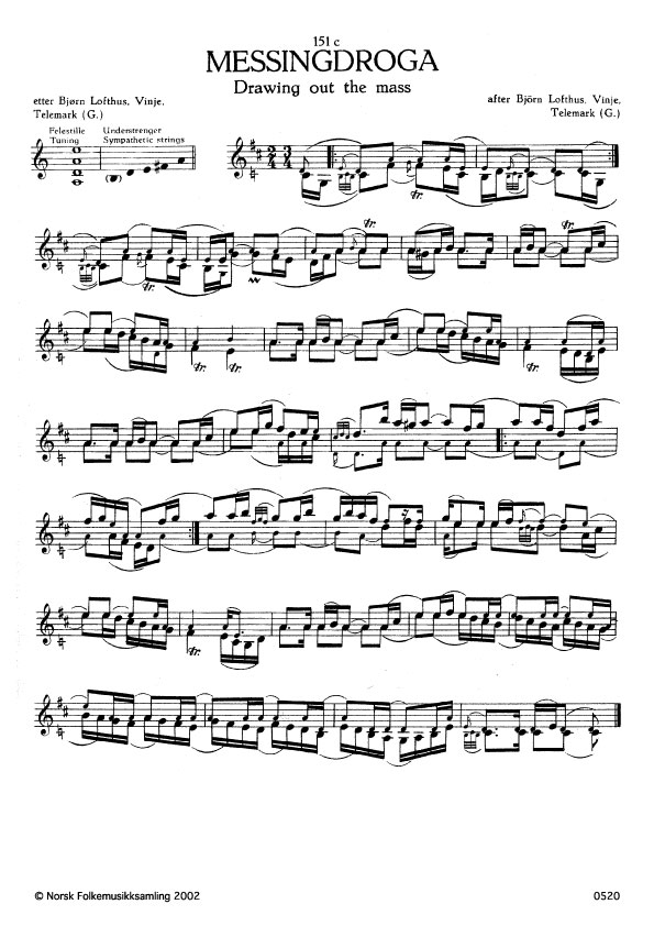 (Messingdroga) G. 651. Oppskr. 1921. Slåttenamnet etter ei gamal kone i Kinsarvik, Hardanger. I kyrkja song ho høgt og langdrege, som ei messing. Derfor kalla dei henne "Messingdroga". Ho bruka å tralla denne slåtten.