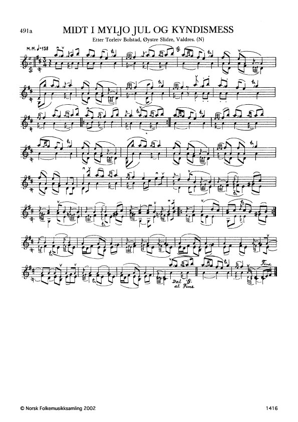 Midt i myljo jul og kyndismess. Etter Torleiv Bolstad, Øystre Slidre, Valdres. N. 1974. Td. 1459. Bolstad lærde slåtten av Gudbrand Beito Haugen, Øystre Slidre.