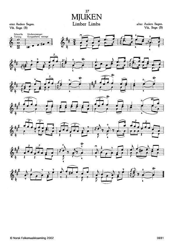 (Mjuken) B. 547. Oppskr. kring 1927. Sagen hadde lært slåtten av Ragnvald Berge, Kyrkjebø, Sogn, i 1840, og denne hadde fått han i 1830-åra av Knut Lurås, Tinn, Telemark. Takt 9 og frametter mykje lik nr. 31, takt 3 og frametter.