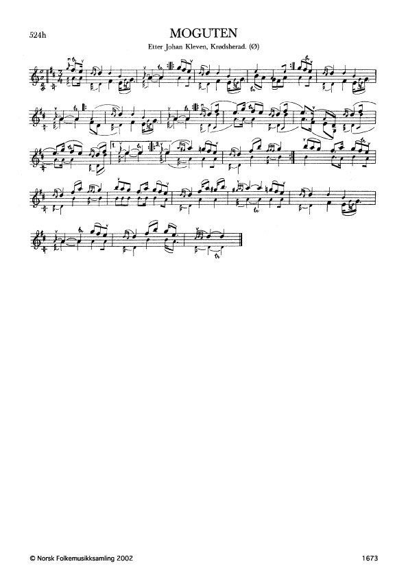 Moguten. Etter Johan Kleven, Krødsherad. Ø. 65, 1933. Kleven hadde slåtten etter far sin, Ola Helgesen Kleiva. Slåttenamnet er etter spelemannen Ole Spelemannsmoen, Eggedal, Buskerud. Andre variantar: G. 525, etter Herbrand Hagen.