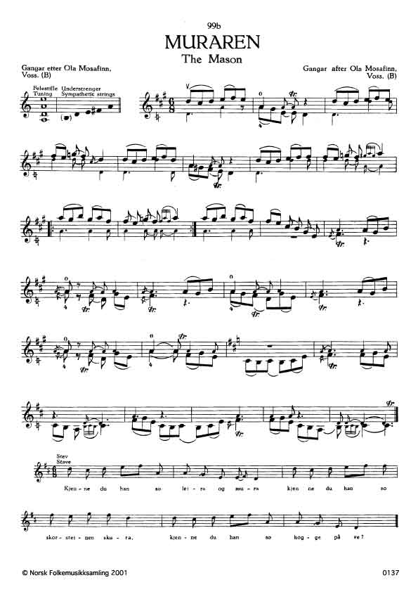 (Muraren) B. 22. Oppskr. 1908. Mosafinn lærde slåtten 1830 av Lars Bergslien, Voss, farfar til kunstnarane Knut og Brynjulf Bergslien. Det finst mange variantar av slåtten både som gangar og halling, sjå såleis Lindeman N.Fj. nr. 2 "Halling" og B. 330. Likeins er det fleire tekstvariantar av slåttestevet, sjå Rikard Berge - Norsk visefugg, Kra. 1904 nr. XXXIII, s. 191. B.s. Ymis trad., s. 193, Irad. Sogn, s. 17 og Trad. Nordhordland, s. 10.