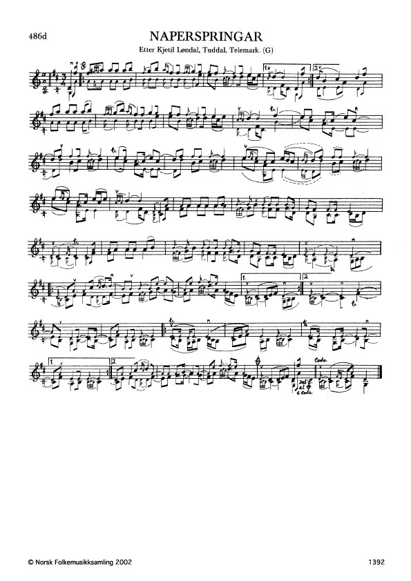 Naperspringar. Etter Kjetil Løndal, Tuddal, Telemark. G. 1497, 1963. Løndal lærde slåtten av Torstein Grotbekk, Heddal. Grotbekk kalla slåtten "Treskreppa", som eigenleg er namnet på ein annan slått. Slåttenamnet her er etter spelemannen Olav Naper, Fyrisdal.