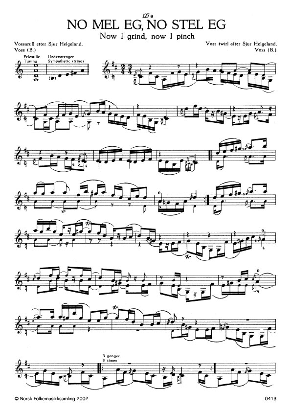 ("No mel eg no stei eg") B. 522. Oppskr. 1922. Helgeland hadde lært slåtten av far sin, Lars H. som venteleg hadde han frå Anders Hagen ("Gamle-Hagen"). Namnet på slåtten skriv seg frå stevet til han.