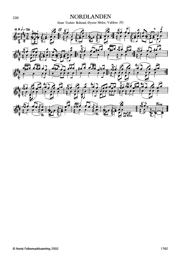 Nordlanden (Svein i Lio). Etter Torleiv Bolstad, Øystre Slidre, Valdres. N. 1977. Td. 1650. Bolstad hadde slåtten etter fleire spelemenn. Andre variantar: G. 1838, etter T. Bolstad.