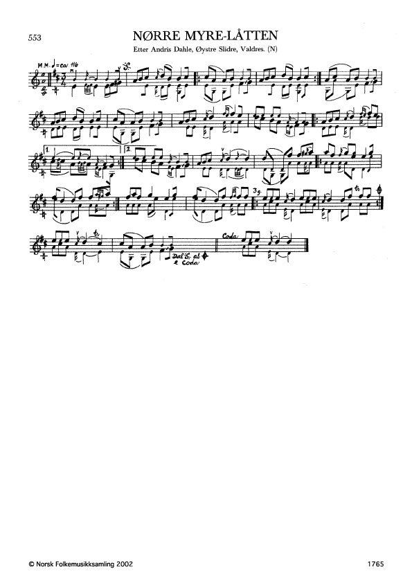 Nørre Myre-låtten. Etter Andris Dahle, Øystre Slidre, Valdres. N. 1977. Td. 1684. Slåtten er i form etter Ivar Ringestad, Vestre Slidre. Andre variantar: G. 1581, etter Ola Bøe. Jfr. band 4 nr. 207.