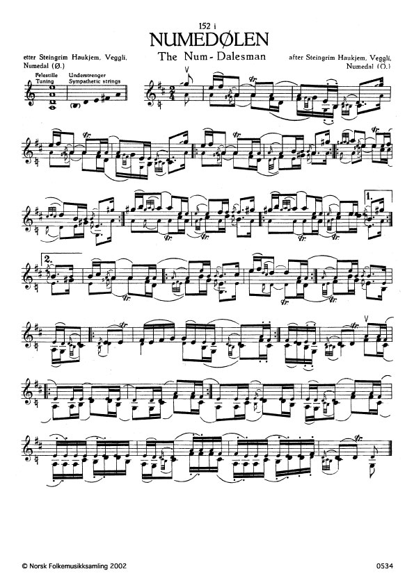 (Numedølen) Ø. 137. Oppskr. 1925. Haukjem hadde truleg slåtten etter Olav Sataslåtten, Torpo, Hallingdal. I takt 30 kjem eit tak som finst i Fossegrimen, Schart nr. 4.