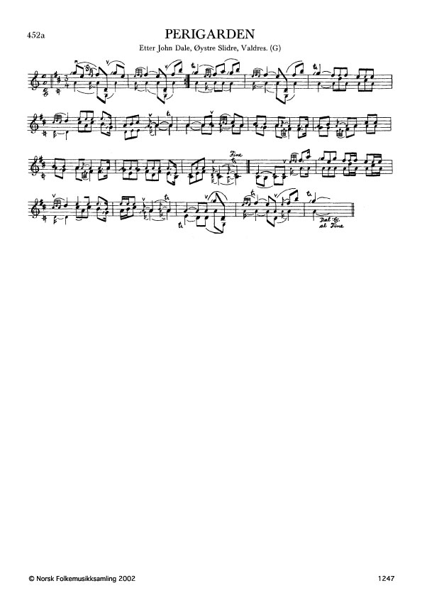 Perigarden. Etter John Dale, Øystre Slidre, Valdres. G. 484, 1922. Dale hadde slåtten etter Jøger Sagahaugen, Øystre Slidre. Perigarden er ein gard i Gol, Hallingdal, og slåtten er oppkalla etter ein flink dansar frå denne garden. (Magne Myhren).