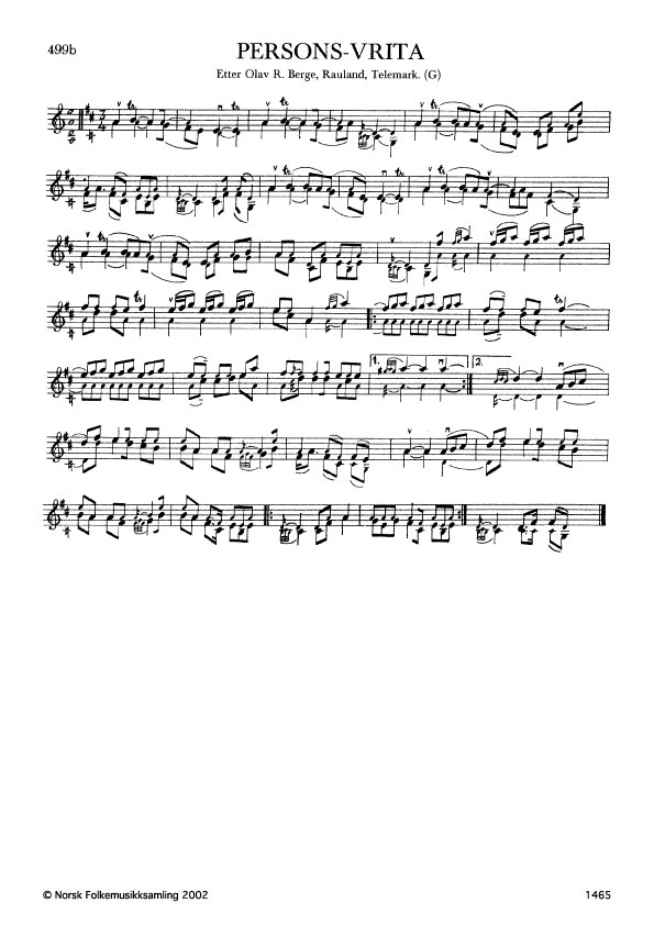 Persons-vrita. Etter Olav R. Berge, Rauland, Telemark. G. 1498, 1964. Groven skreiv slåtten opp etter minne slik han hugsa Olav R. Berge og O. Sandok spela han på "langspel" då han var smågut. Langspelet var eit psalmodikon, men forma på lag som ei fele og med to strenger, ein melodistreng og ein bordunstreng (for fylgjetone). Instrumentet låg på bordet, og strengene vart strokne med boge.