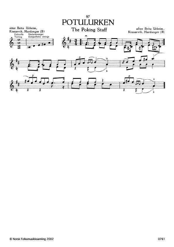 (Potulurken) B. 697. Oppskr. 1916. Brita Urheim tralla slåtten som faren spela på hardingfele. Potulurk kalla dei den lurken som kyrkjetenaren eller klokkaren bruka når han vekte dei som sovna i kyrkja. Pota = stikke, bore, støte med ein kjepp eller ei stong (Ivar Aasen).