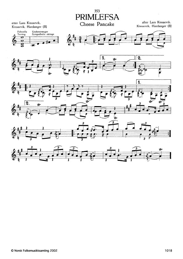 (Primlefsa) B. 220. Oppskr.1924. Kinsarvik lærde slåtten av Oddmund Urheim, Kinsarvik, i 1860. Olav Håstadbø spela og denne slåtten. Det var Urheim som sette namnet på slåtten, slik som han ofte gjorde. Primlefsa var ei stor rund lefse smurd med smør og prim og oppskåren i betar. Gjestebodskost. I sume målføre vert lefsa uttalt lepsa.