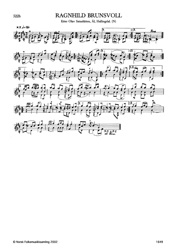 Ragnhild Brunsvoll. Etter Olav Sataslåtten, Ål, Hallingdal. N. 1976. Td. 344. Ragnhild Brunsvoll var frå garden Brunsvoll i Nes. Ho var flink til å danse, og likte særskilt denne slåtten. Andre variantar: G. 765, etter Olav Sataslåtten; Ø. 435, etter Olav Sire, Torpo. Jfr. óg Marta Onstad, band 7 nr. 526.