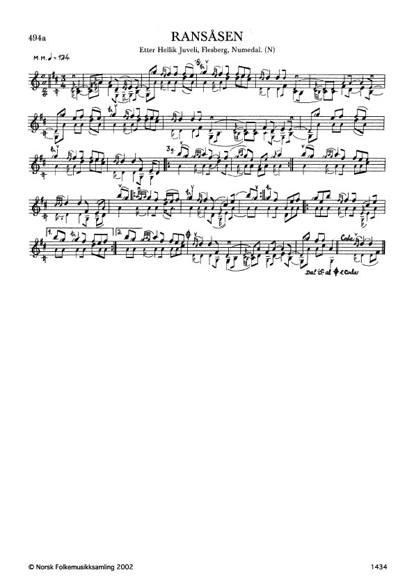 Ransåsen. Etter Hellik Juveli, Flesberg, Numedal. N. 1975. Td. 1535. Ransåsen er ein gamal slått som Gullik Spellemann (1807-1859) spela mykje, og namnet har denne springaren truleg etter dansemeisteren Levor Gulliksen Ransåsen (1788-1857).