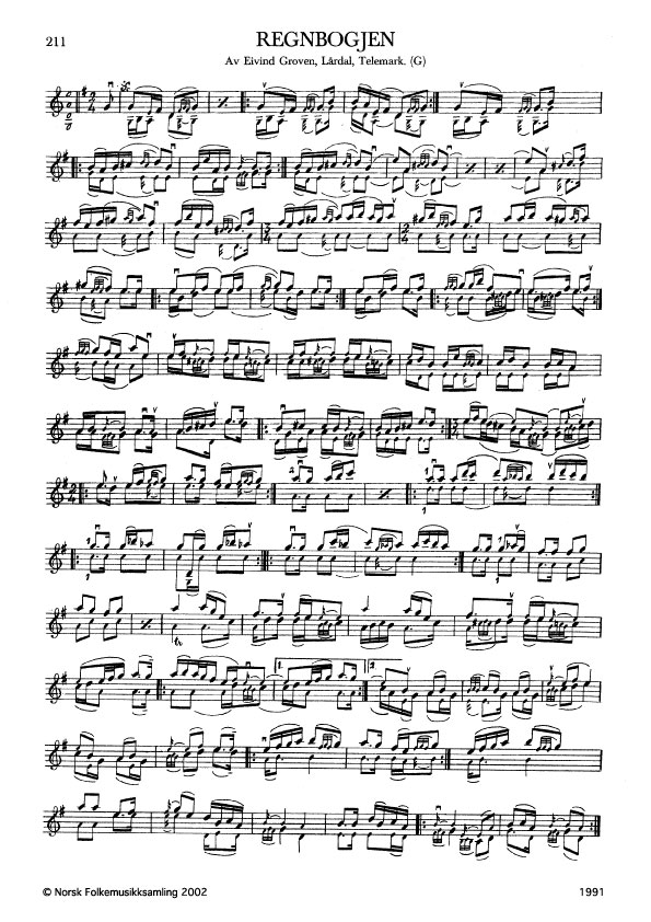 Regnbogjen. Av og etter Eivind Groven, Lårdal, Telemark. G. u. nr. Laga 1962. "… da eg laga Regnbogjen, gjennomførte eg ein svært springande modulasjon…. ei prøve på å kombinere så mange fargar som mogeleg i ein og same slått." Det let seg best gjere ved å bruke vanleg fiolinstille. (Groven i intervju med Y. Daliot 1969-1971). Slåtten vart sett på notar straks han var laga og utsett for to hardingfeler. Urframføring ved Eivind Groven og Magne Manheim, Myllarstemna på Rauland i juli 1962.