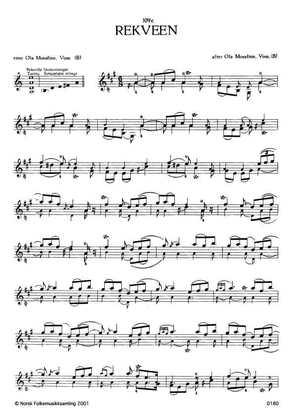 (Rekveen) B. 601. Oppskr. 1908. Mosafinn hadde lært slåtten av Sjur Liland, Voss, som atter hadde han frå Nils Rekve, Vossestrond.