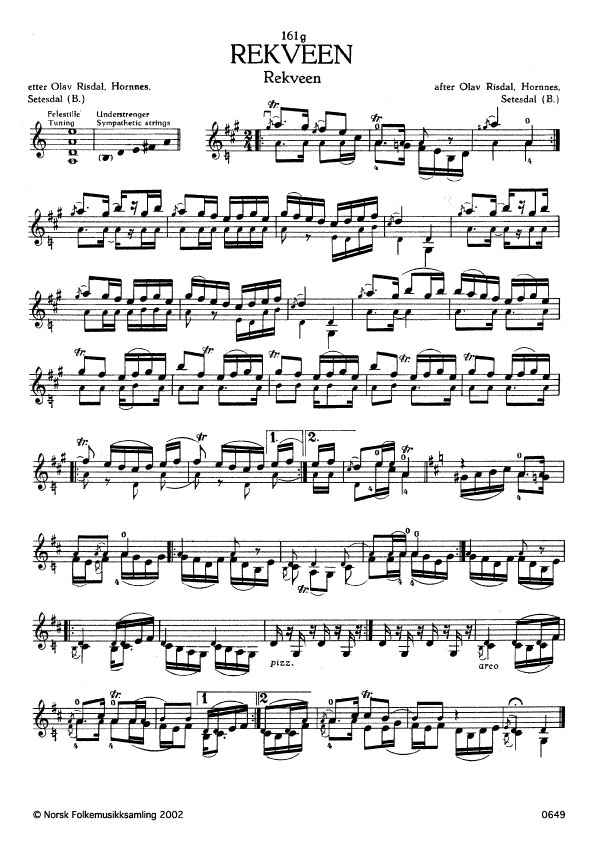 (Rekveen) B. 186. Oppskr. 1917. Risdal lærde slåtten av Pål Frøyrak, Bygland, Setesdal. Denne hadde han frå Neri Nese, Bygland, som atter hadde han frå Peter Veum, Fyresdal, Telemark. Nese var den fyrste som tok med seg hardingfelespel frå Telemark til Setesdal. Før hadde dei der berre bruka flatfele.