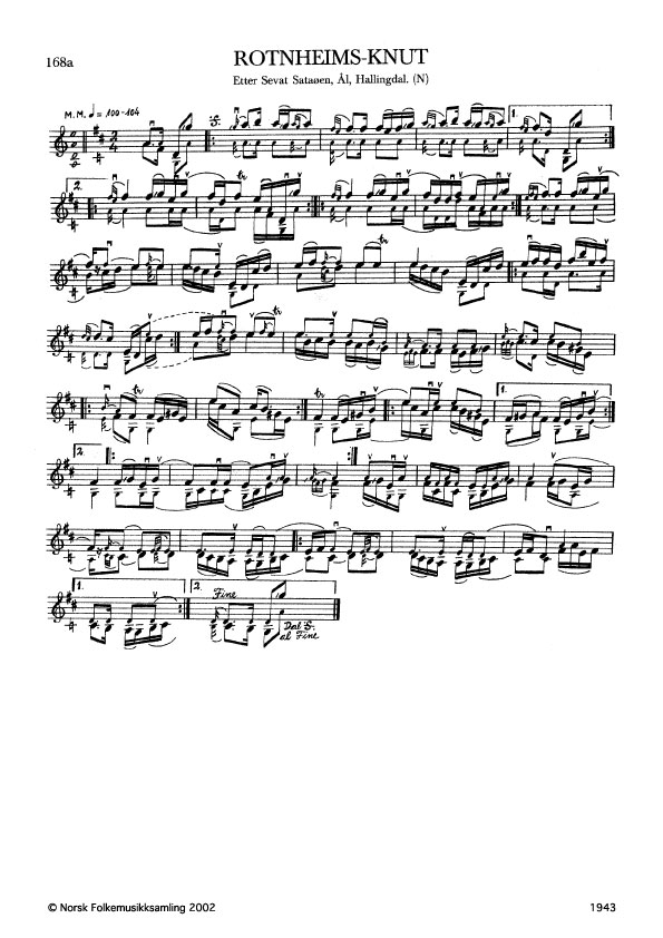 Rotnheims-Knut. Etter Sevat Sataøen, Ål, Hallingdal. N. 1978. Td. 673. Dette er den gamle Hallingdalsforma av slåtten. Jfr. band 3 nr. 154.