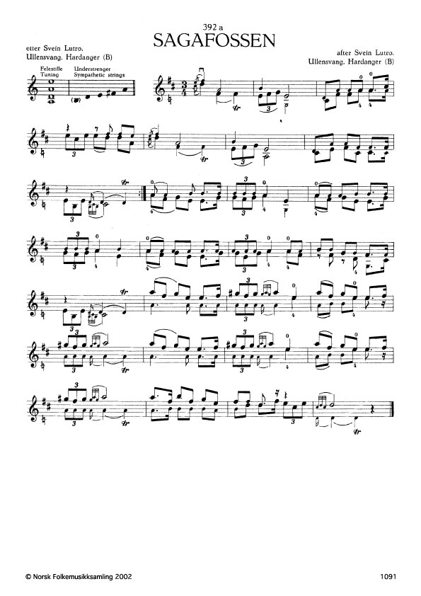 (Sagafossen) B. 409. Oppskr. 1915. Lutro hadde lært slåtten av Lars Urheim, Kinsarvik, Hardanger, som tralla han. Men Urheim hadde høyrt bror sin, Oddmund, spela slåtten. Oddmund hadde lært han av Halvor Sagafossen, Heddal, Telemark. Denne vart kalla "Lånespelaren" eller rettare "Lodnespelaren" av di han skulle ha så fælande langt hår. Det hang i store buskar, og når han spela, hadde han det laget at han duva att og fram med kroppen. Stundom duva han så sterkt at hårtufsane rakk mest heilt i golvet.