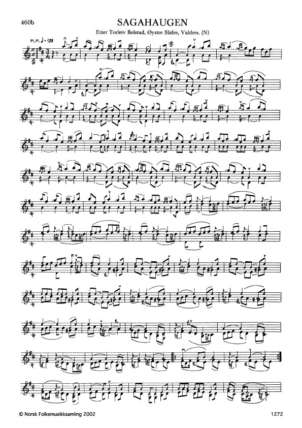 Sagahaugen. Etter Torleiv Bolstad, Øystre Slidre, Valdres. N. 1974. Td. 1463. Jfr. G. 906 og 1128. Bolstad lærde slåtten av Ola Okshovd, og den har namnet etter spelemannen Jøger Sagahaugen, Øystre Slidre.