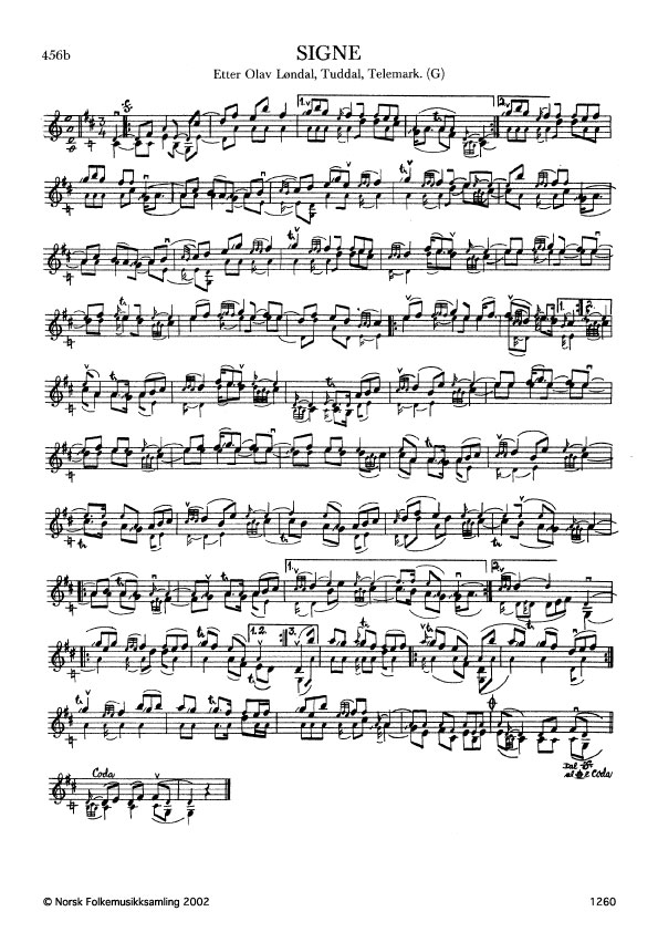 Signe. Etter Olav Londal, Tuddal, Telemark. G. 1465, 1964. NRK magn. 1969. Løndal hadde slåtten etter far sin, Svein Løndal, og han truleg frå Lars Fykerud, som og har vori nemnd som opphavsmann til slåtten. Sjå Bjørndal og Alver: -og fela ho lét, s. 57-58.