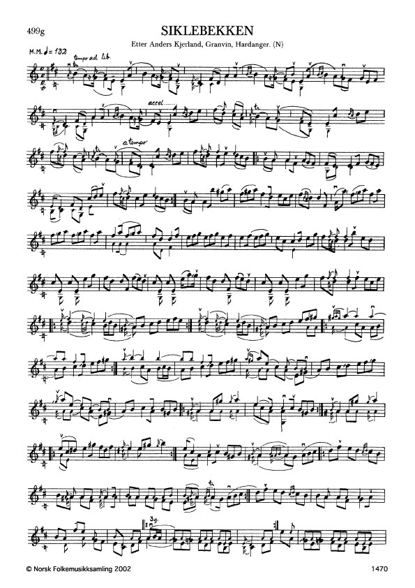 Siklebekken. Etter Anders Kjerland, Granvin, Hardanger. N. 1975. Td. 1496. Kjerland hadde slåtten etter Halldor Meland, Espe i Sørfjorden. Andre variantar: Ø. 50, etter J. Kleven; B. 126, Apalhaugen, etter H. Flatland.