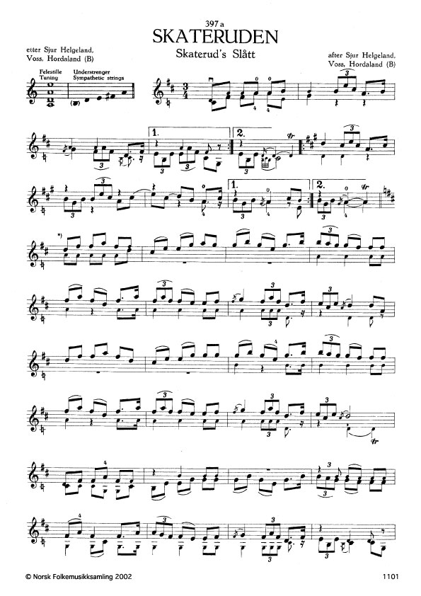(Skateruden) B. 427. Oppskr. 1914. Helgeland hadde lært slåtten av far sin, Lars Helgeland (Brita-Lars), som atter hadde hørt han av Lars Krøsshaug, Øystre Slidre, Valdres. Krøsshaug heldt seg mykje på Voss. Slåttenamnet er etter spelmannen Halvor Skaterud, Volbu, Øystre Slidre. Jfr. Ø.251.