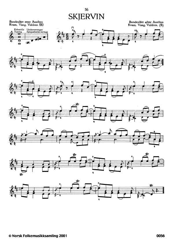 (Skjervin) B. 1034. Oppskr. 1940. Kvam lærde slåtten av far sin, som hadde han frå Trond Eldtun, og denne atter frå Knut Nordland. Namnet "Skjervin" er truleg etter spelmannen Embrik Skjervin, Vang, Valdres. Sjå B.s. Trad. Valdres s. 64.