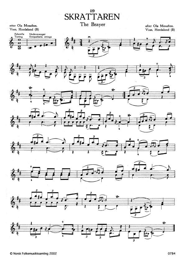 (Skrattaren) B. 114. Oppskr. 1908. Mosafinn lærde slåtten berre 7 år gamal av far sin, Sjur Liland. Mosafinn gav slåtten namnet Skrattaren av di 4. og 5. takt kunne likna på skratting.