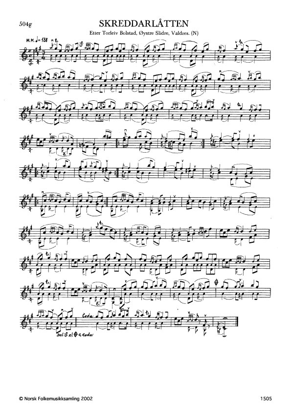 Skreddarlåtten. Etter Torleiv Bolstad, Øystre Slidre, Valdres. N. 1975. Td. 1459. Jfr. G. 1500. Bolstad spela slåtten i form etter Nils Beitohaugen, Øystre Slidre. Andre variantar: Ø. 32, Skinntrøya, etter A. Vinna.