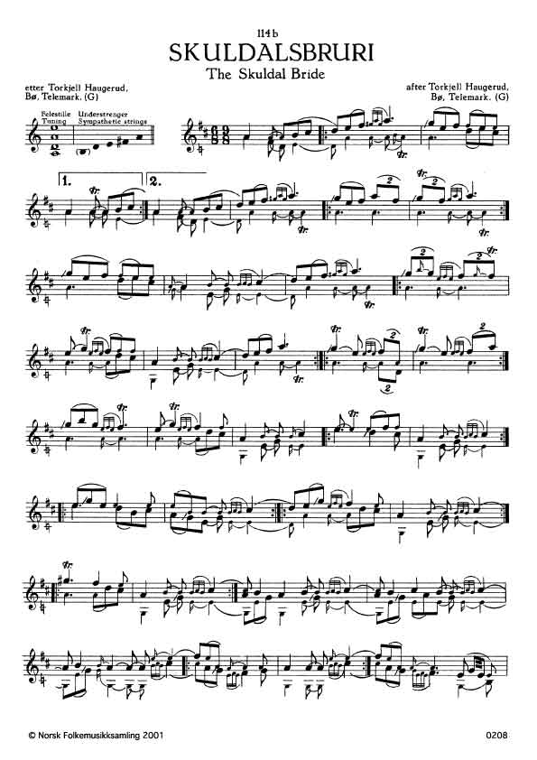 (Skuldalsbruri) G. 35. Oppskr. 1939 etter opptak i NRK. Haugerud hadde slåtten etter Knut Dale, Tinn, Telemark. Jfr. Halv. nr. 15. Etter Torkjell Haugerud så datt Signe Skuldal av hesten og braut av seg lårbeinet. Dei fekk henne heim og i seng, men ho bad dei andre tura og dansa og moroa seg. Og for å setja liv i lyden tralla ho så denne slåtten. Men beinbrotet verkte fælt. Ho krauna seg. Dette kjem fram i ei vendsle i slåtten der det bryt mellom 6/8 og 3/8 takt. (Sjå takt 43). I 3/8-takti er det som ho ankar seg midt i songen. B.s. Spelmenn, Telemark s. 174.
