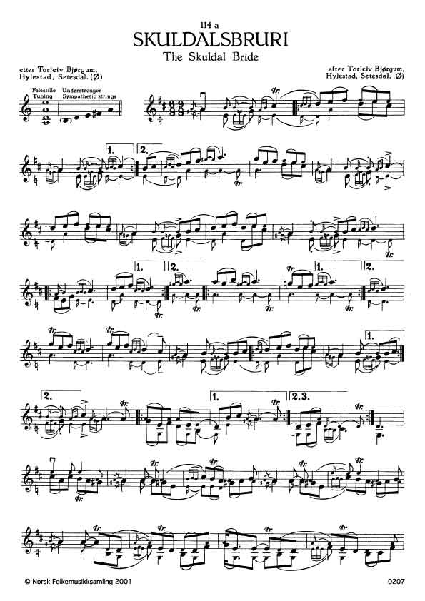 (Skuldalsbruri) Ø. 346. Oppskr. 1953 etter opptak i NRK. Bjørgum hadde lært slåtten av Halvar S. Rysstad, Hylestad, Setesdal. 114a-f er variantar. Slåtten har fleire namn. I Krødsherad kallar dei han "Håvardsgangar", truleg etter Håvard Gibøen, og i Telemark "Steinar Åse". Sjå R. Berge - Håvard Gibøen, Skien 1932 s. 28. Det skal vera Myllarguten som laga slåtten. Signe Skuldal, Seljord vart tvinga til å gifta seg med granneguten Steinar Åse som var ein dårleg kar. Ho drukna seg i Skuldalsvatnet. Sjå B.s. Ymis trad. s. 315a (etter Torkjell Haugerud). Segna finst i fleire variantar, sjå Johs. Skar - Gamalt or Sætesdal V, Kra. 1911 s. 136, M. B. Landstad-Ættesagaer, Kra. 1924 s. 113. Syn og Segn, Kra. 1904 s. 326-327. S. Bugge og R. Berge - Norske eventyr og sagn, Kra. 1909 s. 25-27. R. Berge - Norsk sogukunst 1924, s. 12. Norsk Folkekultur 1934, s. 42. Også stevet finst i fleire variantar, sjå B.s. Spelmenn, Telemark, s. 54 (etter A. J. Brekke). Ibid. s.147 (etter Sigurd Torgeirson). R. Berge-Norsk Visefugg, Kra. 1904 s. 177. Johs. Skar - Gamalt or Sætesdal, V, Kra. 1911 s. 136. Hos Skar lyder det slik: "Mykji ti Mann aa snei ti Gut va Steinar Aasi, ha' 'an 'kji legje me Fante-Fjaasi, ha' 'an 'kji stole den Tobaksdausi", sa Signe Skuldal før ho sprang på vatnet. Myllarguten tralla dette verset og då teksta var slutt, heldt han fram med tulling og lilling til heile slåtten var utbygd. Slåtten er elles trykt: Halv. nr. 15. O. Frøysa - Kjende slåttar av Eivind Aakhus, Oslo 1929, nr. 6. T. Torgeirson - Møllargutens slåtter, Oslo 1924, nr. 3.