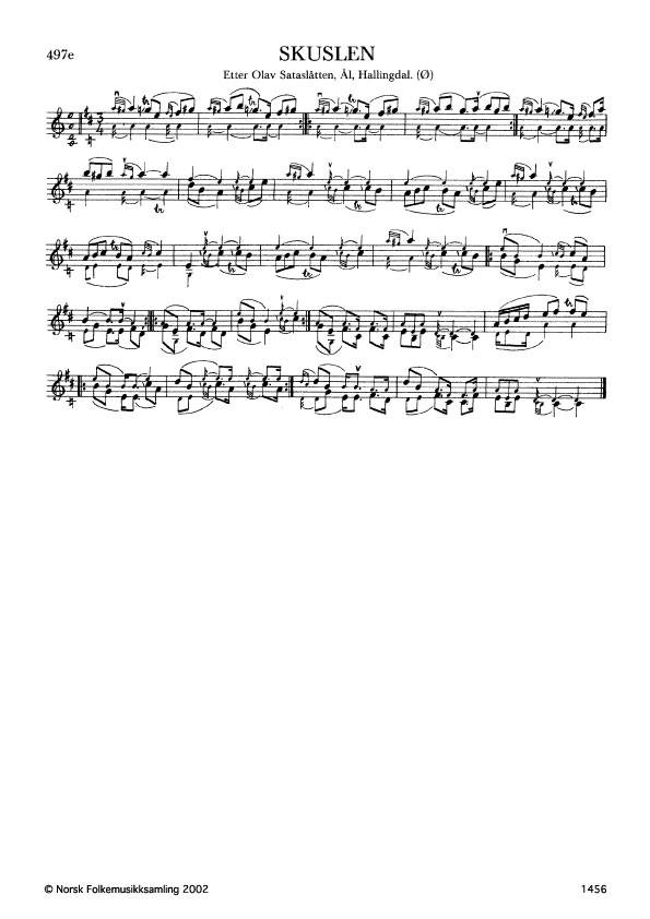 Skuslen. Etter Olav Sataslåtten, Ål, Hallingdal. Ø. 503, 1956. Sataslåtten hadde lært slåtten av Ola Dekko, Torpo i Ål, men har og blanda inn nokre tak frå Fanteladda, band 5 nr. 325.